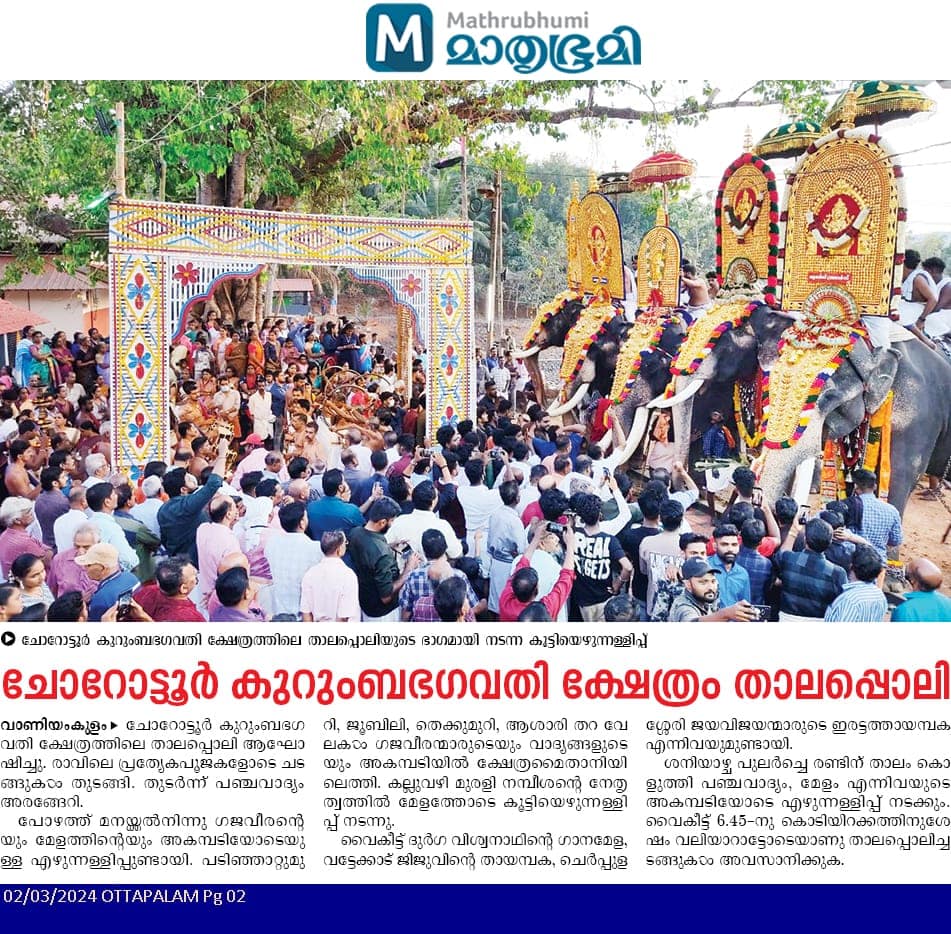 താലപ്പൊലി കുംഭമാസത്തിൽ ഉത്രം നക്ഷത്രം അർദ്ധരാത്രിക്കുള്ള ദിവസം കൊടിയേറ്റം എന്നാണ് വ്യവസ്ഥ. ഉത്രം കൊടിയേറി അഞ്ചാംദിവസം താലപ്പൊലി പാട്ടുതാലപ്പൊലിയായിട്ടാണ് ആഘോഷം. കുംഭം ഉത്രം അർദ്ധരാത്രിക്കുള്ള ദിവസം രണ്ടുവരുമെങ്കിൽ ആദ്യത്തേത് സ്വീകരിക്കുന്നു. കൊടിയേറി അഞ്ചുദിവസവും പറയെടുപ്പ് പതിവുണ്ട്. കൊടിയേറി പാട്ട് കുറയിട്ടാൽ ശ്രീമൂലസ്ഥാനത്തേക്ക് പോഴത്തിലേക്ക് പുറപ്പെടുന്നു. വഴിയിൽ വേങ്ങശ്ശേരി വിഷ്ണുക്ഷേത്രത്തിൽ പറവെപ്പുണ്ട്. പോഴത്തില്ലത്തുള്ള മച്ചിൽ ഭഗവതിയെ ഇറക്കി പൂജിക്കുന്നു. തിരിച്ചുവന്നാൽ കുളത്തിൽ ആറാട്ട്, നവകാഭിഷേകത്തോടെ പൂജ, ശ്രുഭൂതബലി ഇത്രയും താന്ത്രിക കർമ്മങ്ങൾ നിർവ്വഹിക്കണം. തുടർന്ന് കളംപൂജ, അത്താഴം, പൂജ ഇതാണ് ക്രമം. പാട്ടുതാലപ്പൊലിയായതുകൊണ്ട് കൊടിയേറി കൊടിയിറങ്ങുന്നതുവരെ കളമെഴുത്തുപാട്ട് നിർബന്ധമാണ്.